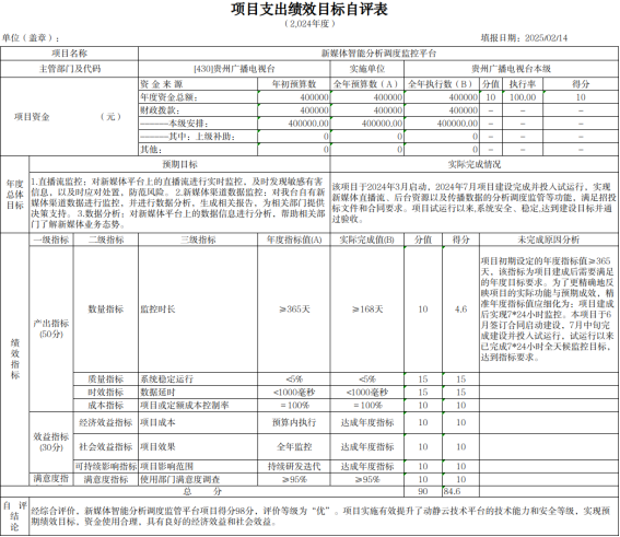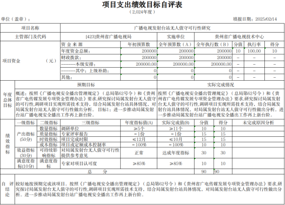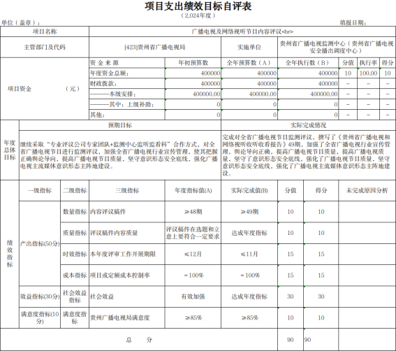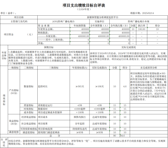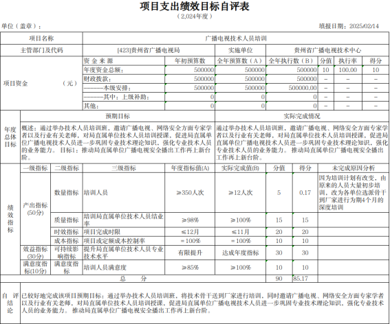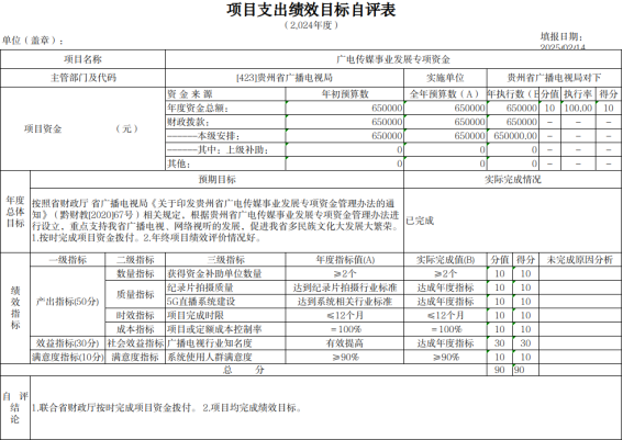 2025年3月,根据项目下达情况,我局下发《省广电局关于开展2024年度项目支出绩效自评的通知》,并要求各单位结合2024年年初预算填报中项目绩效目标设定情况撰写项目支出绩效评价报告,报告包含立项情况、资金安排及使用情况、项目实施内容及进展情况、绩效目标完成情况、存在的问题及改进措施等。截止2025年5月,全省各市(州)广电主管部门、项目单位、局属单位已全部完成绩效自评工作,自评报告中预算执行率为98.38%,对资金使用情况、项目实施进展情况均做认真阐述,并取得了预期的社会效益。我局自评等级优。