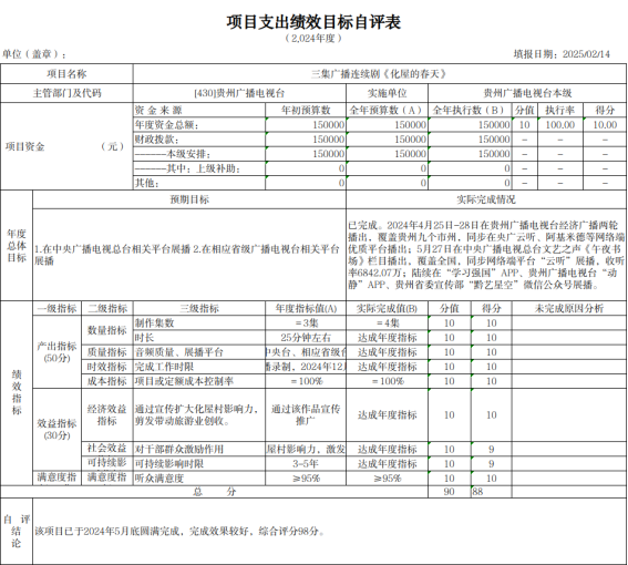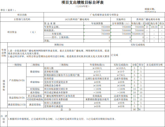 2025年3月,根据项目下达情况,我局下发《省广电局关于开展2024年度项目支出绩效自评的通知》,并要求各单位结合2024年年初预算填报中项目绩效目标设定情况撰写项目支出绩效评价报告,报告包含立项情况、资金安排及使用情况、项目实施内容及进展情况、绩效目标完成情况、存在的问题及改进措施等。截止2025年5月,全省各市(州)广电主管部门、项目单位、局属单位已全部完成绩效自评工作,自评报告中预算执行率为98.38%,对资金使用情况、项目实施进展情况均做认真阐述,并取得了预期的社会效益。我局自评等级优。