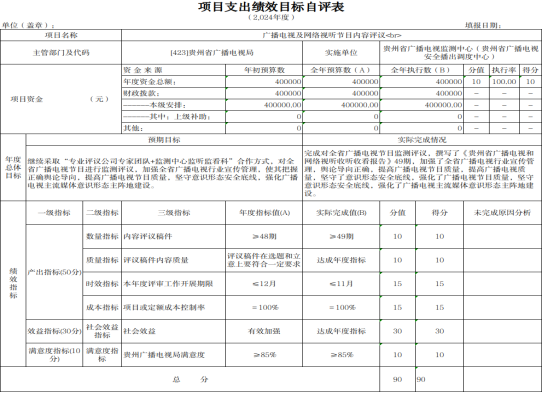 按照《省财政厅关于加强2025年预算绩效管理工作的通知》(黔财绩〔2025〕1号)要求,性吧 (以下简称“省广电局”)于2025年2月19日至2025年5月15日对2024年贵州省广电传媒事业发展专项资金开展了项目绩效评价,现就评价情况报告如下:
